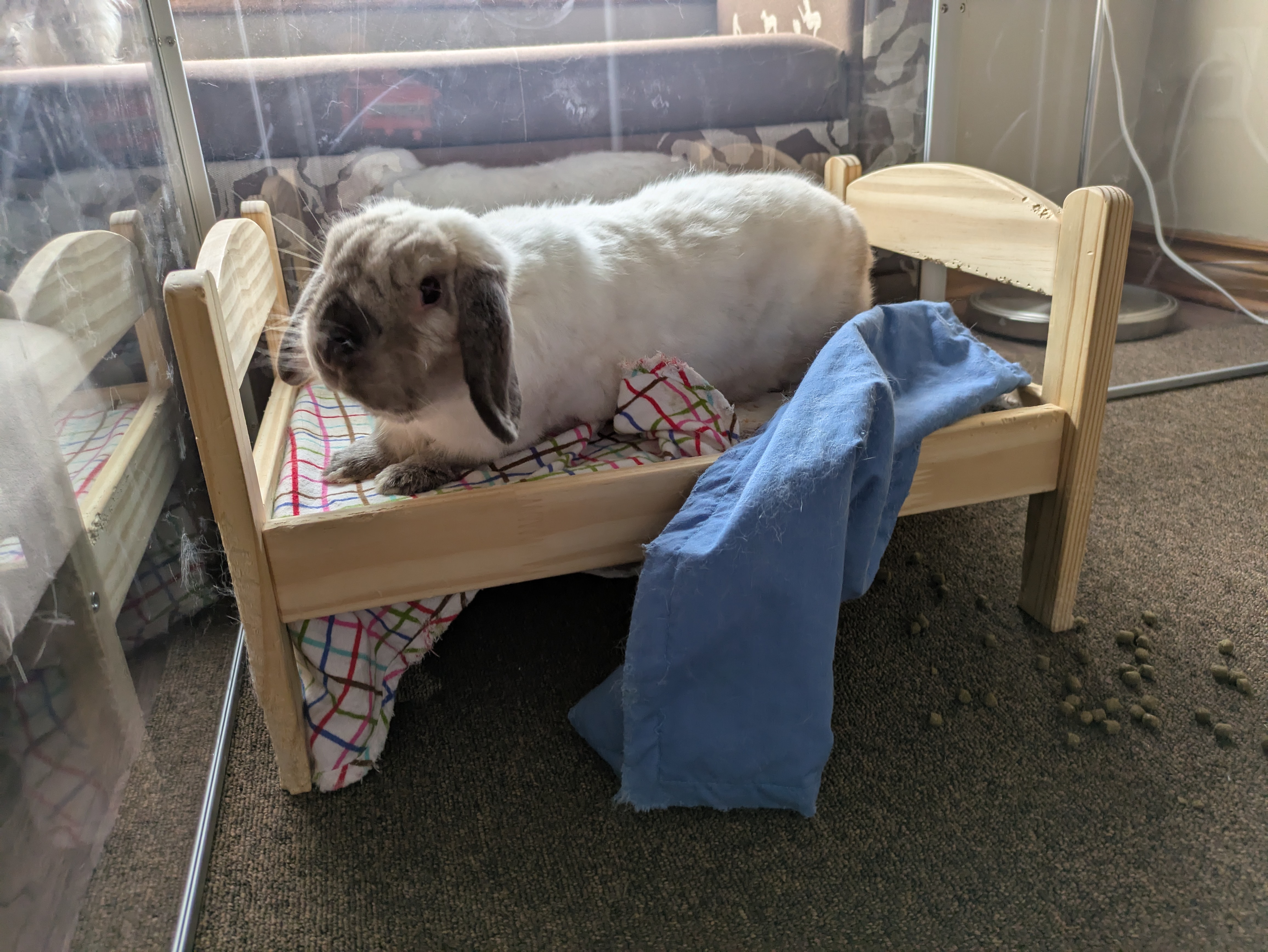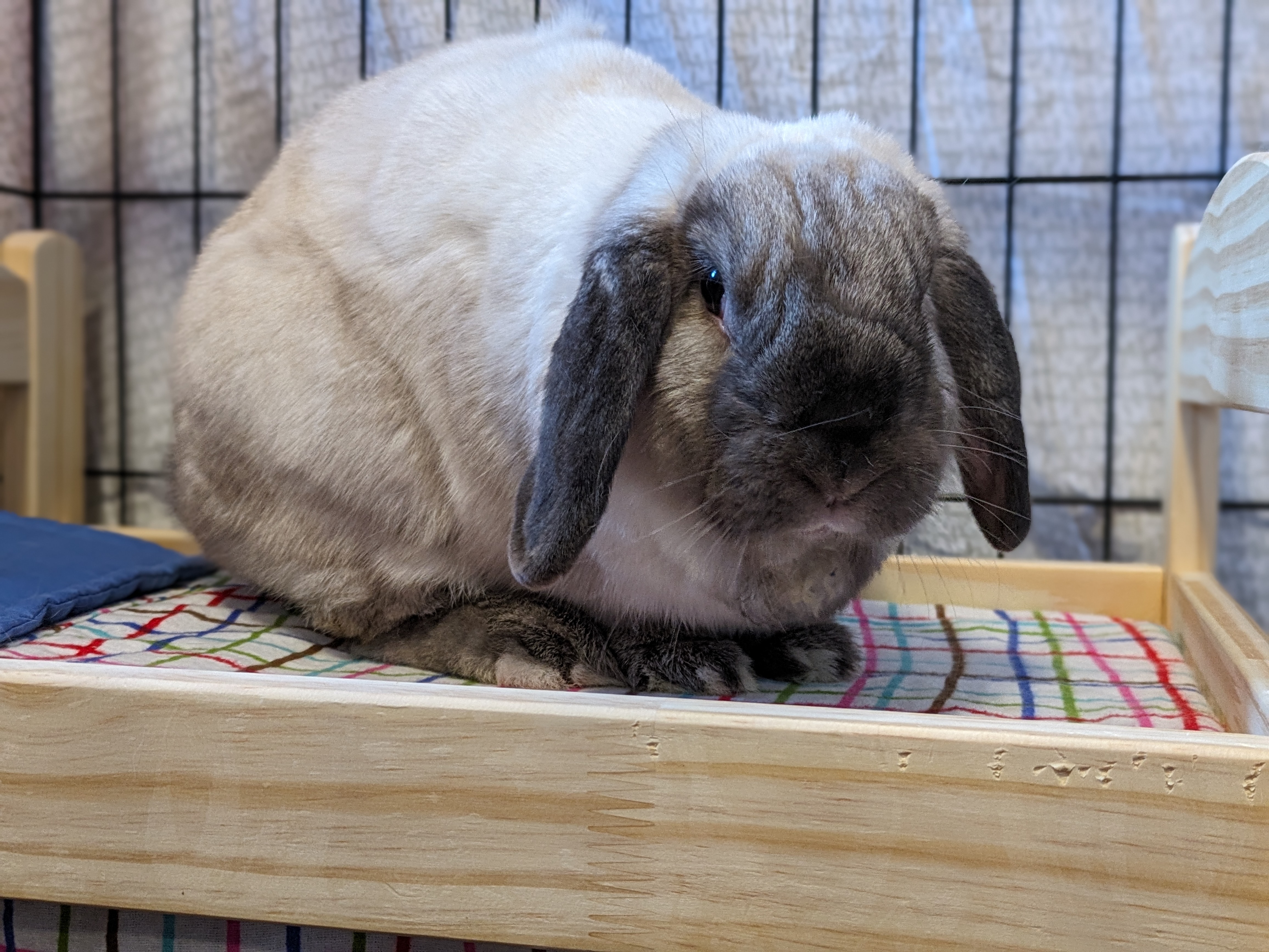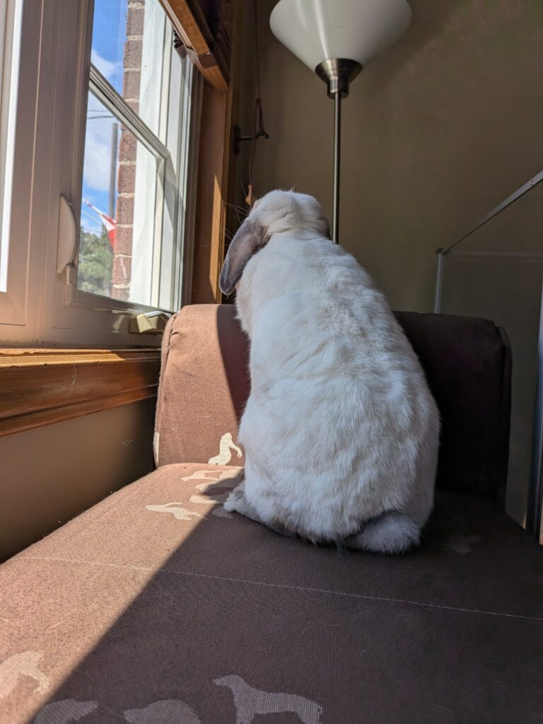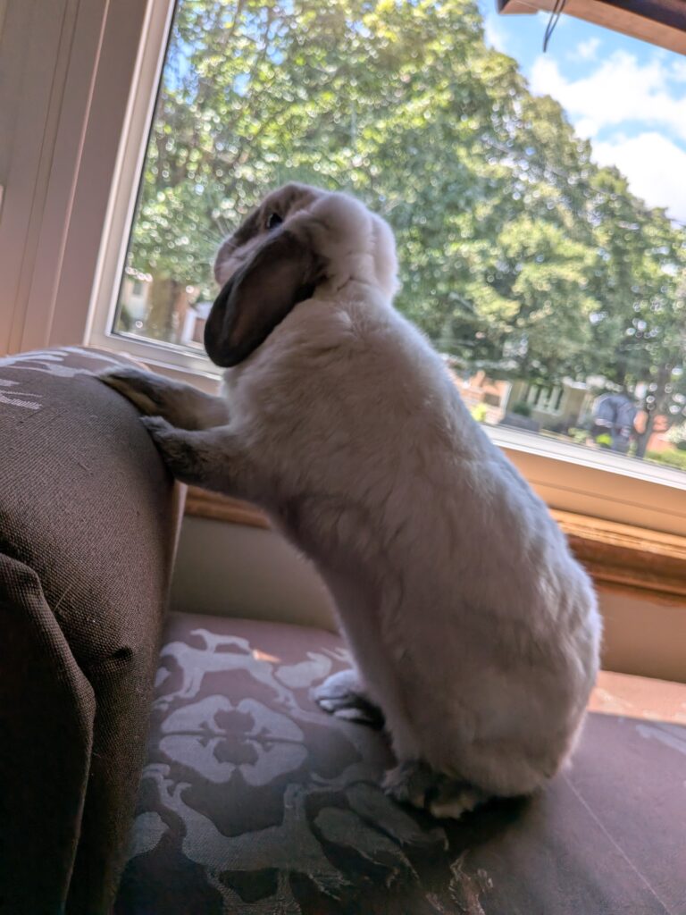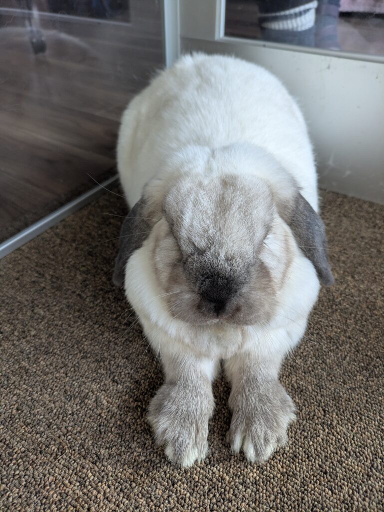 Essie would be a wonderful free-roaming bunny. She loves to run around and jump onto furniture, and show off epic binkies and zoomies! Her favourite spot is the cat tree (minus the cats of course). She loves to dig at the bottom and flop. Her least favourite thing? The vacuum, it’s her mortal enemy. She also enjoys redecorating and reorganizing her space, her foster family calls it her “bun-shui”. Don’t try helping her either, she can do it herself because she’s a strong independent ladybun!