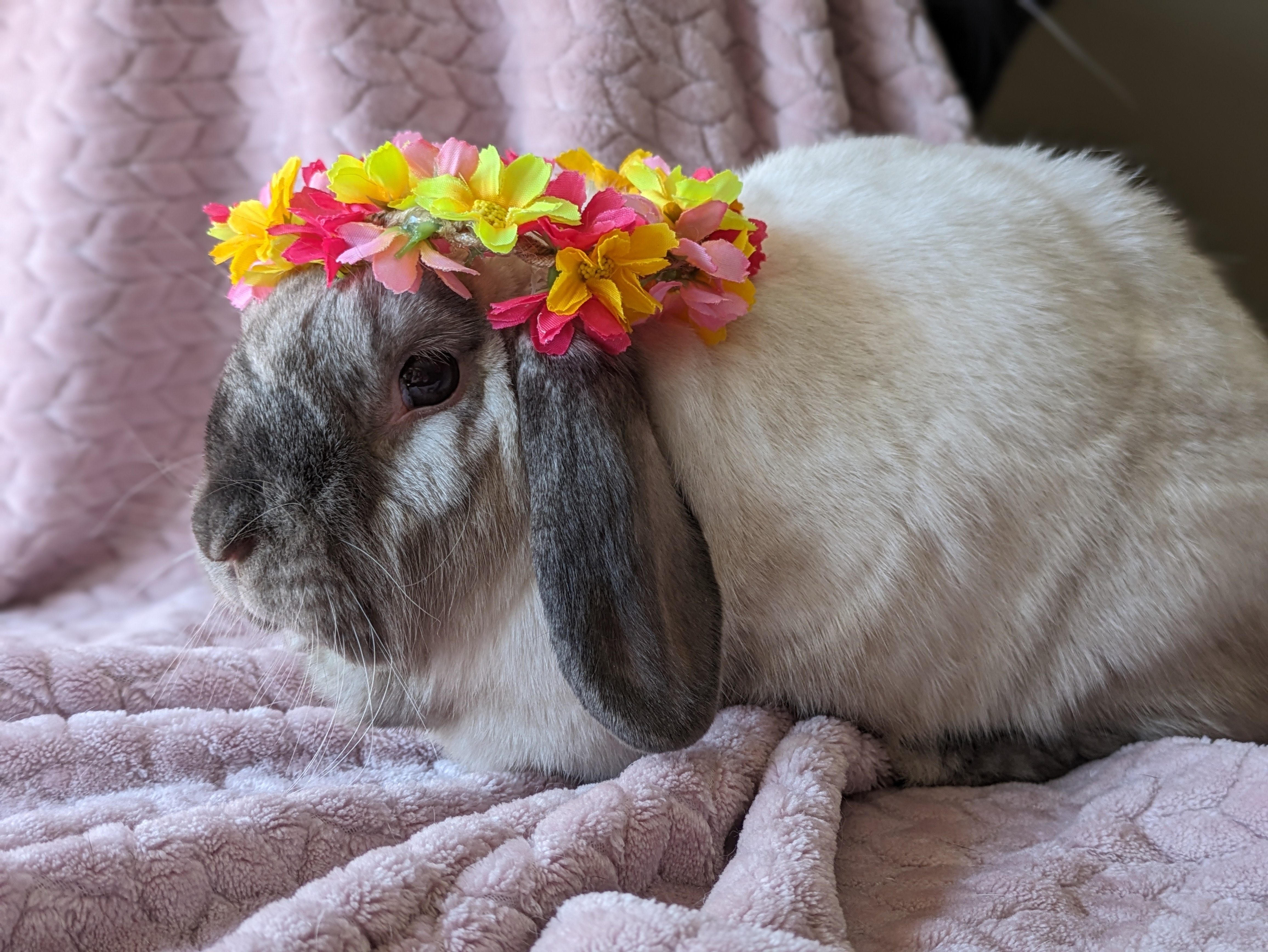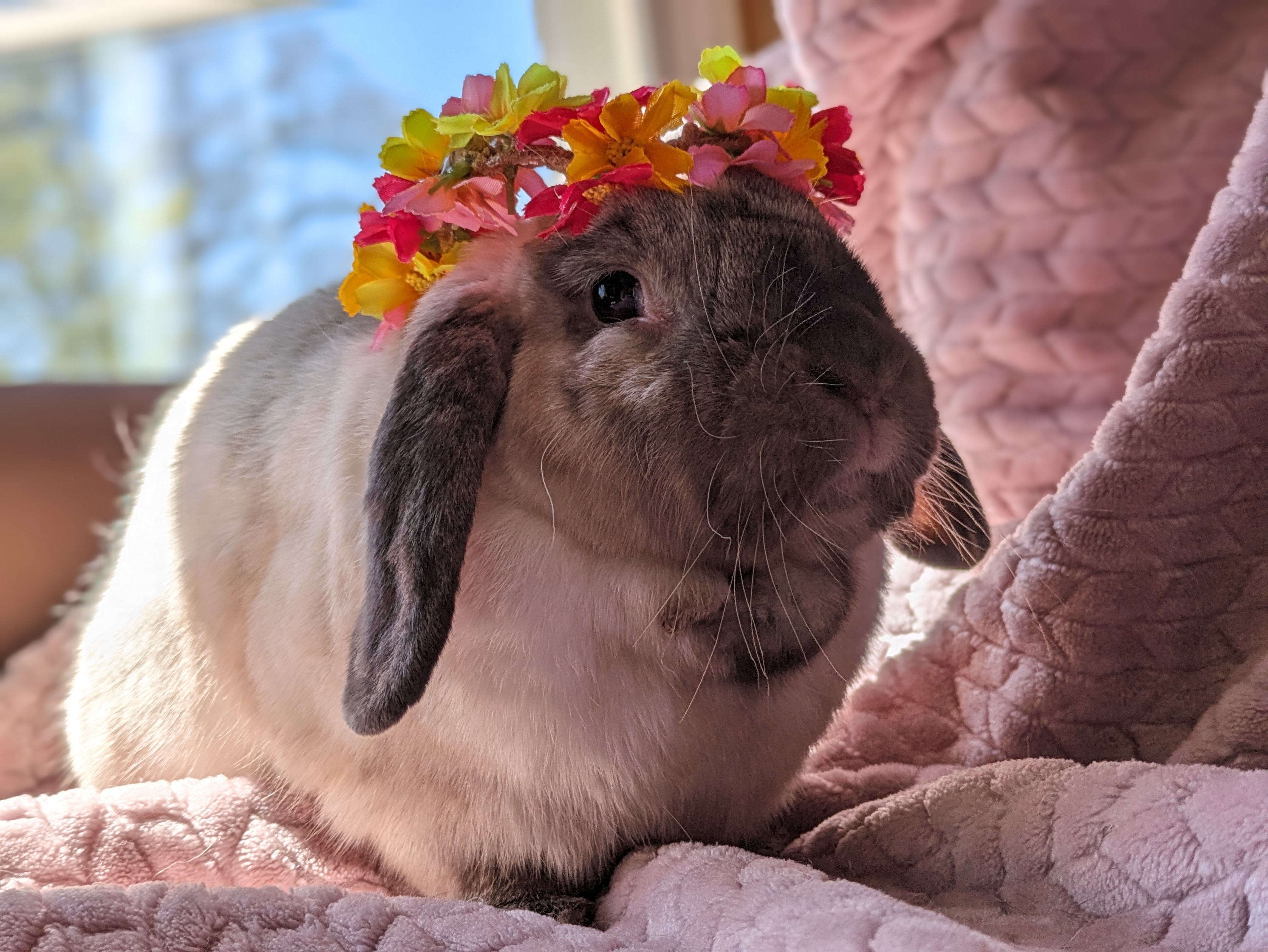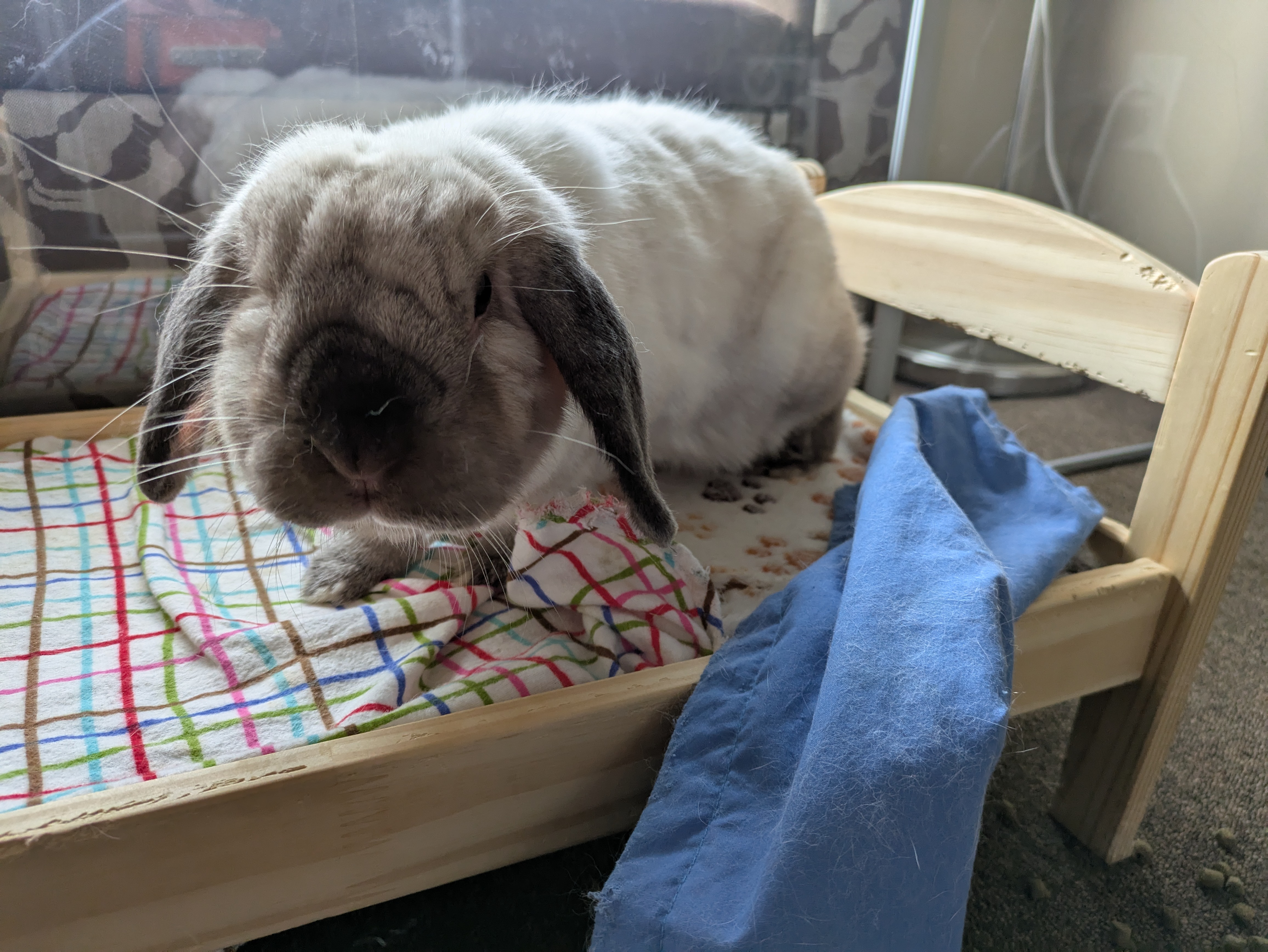 Essie would be a wonderful free-roaming bunny. She loves to run around and jump onto furniture, and show off epic binkies and zoomies! Her favourite spot is the cat tree (minus the cats of course). She loves to dig at the bottom and flop. Her least favourite thing? The vacuum, it’s her mortal enemy. She also enjoys redecorating and reorganizing her space, her foster family calls it her “bun-shui”. Don’t try helping her either, she can do it herself because she’s a strong independent ladybun!