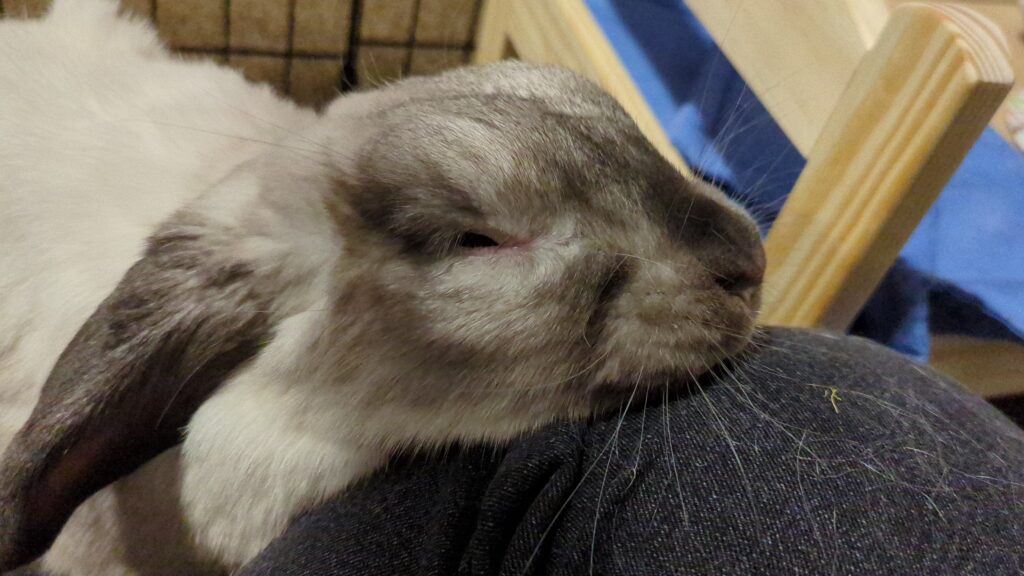 Essie loves her people dearly. She’ll follow you around, mostly so you continue to give her pets, or she’ll beg with those big bunny eyes for some treats. Her favourite treat is banana, and oh boy does she have happy butt twitches when she gets it! If you lay down with her, you’ll definitely get a lot of love in the form of many chins and even kisses.