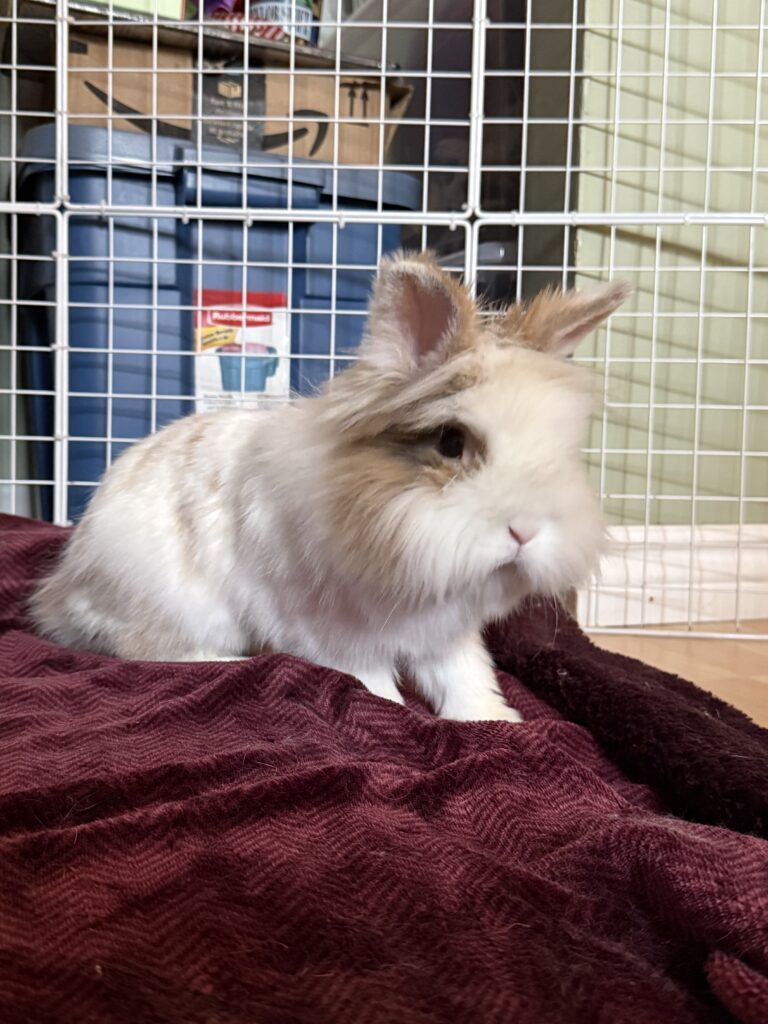 She is a fantastic hay eater, loves her pellets, and enjoys her greens. Her favourite treats are the Orchard Loops. Her litter box skills are good, and are improving every day since she was spayed at the end of March.